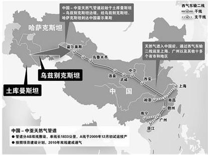 席胡锦涛2009年12月14日出席在土库曼斯坦阿姆河(东五区)右岸举行的中国-中亚天然气管道通气仪式。北京时间11时35分,四国元首共同打开管道启动阀门,中国-中亚天然气管道成功实现通气。读中国-中亚天然气管道示意图,回答7-9题