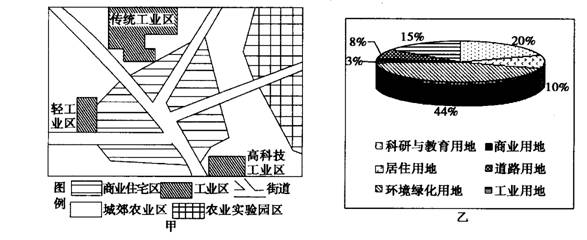 例2:甲图是我国东部沿海地区某城市功能区分布略图,乙图为该城市某工业区土地利用统计图,读图回答1-2题。