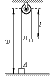 (20分)如图所示,A、B两个小物体(可看成质点)的质量分别为2m、m,它们栓接在跨过定滑轮的细绳两端,细绳不可伸长,且能承受足够大的拉力。B物体悬吊着静止时,A也静止在地面上,A、B与定滑轮轮轴之间的竖直距离分别为2l、l。现将B物体竖直向上提高距离l,再将其从静止释放。每次细绳被拉直时A、B速度的大小立即变成相等,且速度方向相反,由于细绳被拉直的时间极短,此过程中重力的作用可以忽略不计。物体与地面接触时,速度立即变为0,直到再次被细绳拉起。细绳始终在滑轮上,且不计一切摩擦。重力加速度为g。求