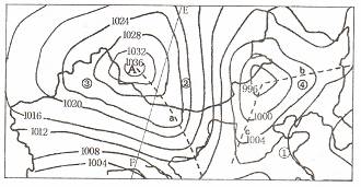 (1)从气流运动状况而言,此时控制A地区的天气系统是 ,天气状况是 。图中虚线(a、b、c)附近易形成冷锋的是 ,b系统过境后的天气状况是 。