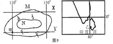 读下面某地区等压线分布图和印度洋局部海区图,完成7--9题。