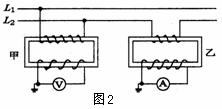 如图所示,L1和L2是高压输电线,利用甲、乙可以测输电线路电压和电流。若已知甲的原副线圈匝数比为1000:1,乙的原副线圈匝数比为1:l00,并且已知电压表两端的电压为220V,通过电流表的电流为10A,则