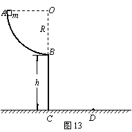 (7分)如图12所示,AB是在竖直平面内的1/4圆周的光滑圆弧轨道,其半径为R,过圆弧轨道下端边缘B点的切线是水平的,B点距正下方水平地面上C点的距离为h。一质量为m的小滑块(可视为质点)自A点由静止开始下滑,并从B点水平飞出,最后落到水平地面上的D点。重力加速度为g,空气阻力可忽略不计,求:![]()