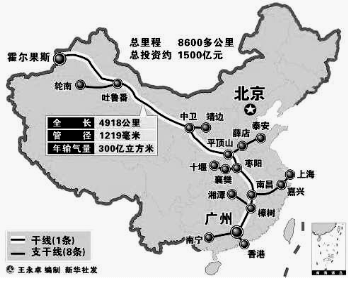 材料一:2008年初,世界最长的跨国天然气管道西气东输二线工程正式开工。该工程外连土库曼斯坦的中亚天然气管道,西起我国霍尔果斯,南至广州、深圳和香港,是世界上最长的跨国天然气管道,将国内外天然气输送到珠江三角洲、长江三角洲,为我国东部地区提供清洁能源,意义重大,影响深远。