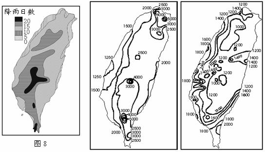 (2)根据材料二,影响甲岛七月雨日等值线分布的最主要因素是 、 ;材料三显示该岛年平均降水量的分布特征是 。