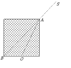 28、如图所示,一圆柱形容器底面直径和高度相等,当在S处沿容器边缘的A点方向观察空筒时,刚好看到筒底圆周上的B点,保持观察点位置不变,将筒中注满某种液体,可看到筒底的中心点O,试求这种液体的折射率为多少?