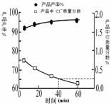 KH2PO4(aq)+HCl(aq),当反应时间不同时,产品产率和产品中Cl‑含量变化情况如图所示。KDP晶体的一级品标准:Cl-质量分数低于0.2%。