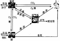 的排放,“四位一体”(人居-种植-养殖-沼气)生态农业是以沼气为纽带,将沼气池、猪禽舍、蔬菜栽培与日光温室有机地组合在一起。下图是该系统物质循环的示意图,请分析回答下列问题: