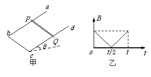 如图甲中abcd为导体做成的框架,其平面与水平面成θ角。质量为m的导体棒PQ与ab、cd接触良好,回路的电阻为R,整个装置放于垂直框架平面的变化的磁场中,磁感强度B随时间变化规律如图乙,PQ始终保持静止。在0-t时间内,PQ受到的摩擦力f的大小变化情况是