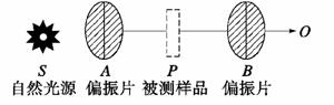 奶粉的碳水化合物(糖)的含量是一个重要指标,可以用“旋光法”来测量糖溶液的浓度,从而鉴定糖含量。偏振光通过糖的水溶液后,偏振方向会相对于传播方向向左或向右旋转一个角度α,这一角度α称为“旋光度”,α的值只与糖溶液的浓度有关,将α的测量值与标准值相比较,就能确定被测样品的含糖量了。如图所示,S是自然光源,A、B是偏振片,转动B,使到达O处的光最强,然后将被测样品P置于A、B之间,则下列说法中正确的是( )