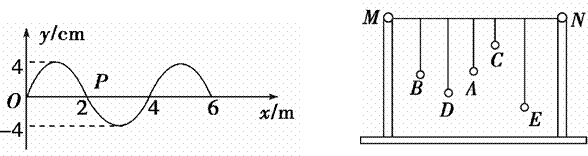 (2) 如图所示,在探究共振现象的实验中发现:当作用在装置上MN间的驱动力的频率与上述横波的频率相同时,MN间五个单摆中D摆恰好发生共振。现测得D摆摆线长l=99.6cm。摆球的直径d=0.8cm,求当地重力加速度g。(结果取2位有效数字)