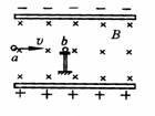 如图所示,带电平行金属板相互正对水平放置,两板间存在着水平方向的匀强磁场。带电液滴a沿垂直于电场和磁场的方向进入板间后恰好沿水平方向做直线运动,在它正前方有一个静止在绝缘小支架上不带电的液滴b,带电液滴a与液滴b发生正碰,在极短的时间内复合在一起形成带电液滴c。若不计支架对液滴c沿水平方向的作用力,则液滴c离开支架后