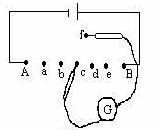 ③在两接线柱A、B连线上等距离找出5个基准点a、b、c、d、e.灵敏电流表G的一根探针接在c点,另一探针接在f点,则电流表指针向_____偏(已知此电流表指针偏转方向与电流的关系为“右进右偏,左进左偏”).为找到与c点电势相等的点,接f点的探针应向_____移.