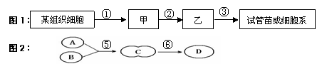 (1)利用图2方法得到杂交瘤细胞的⑤过程中,常采用不同于植物体细胞杂交的诱导方法是用_________________作诱导剂,不同细胞能够融合的原因是 。