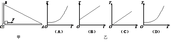 如图甲所示,OA为一质量分布均匀的横梁,横梁始终保持水平状态,被一轻质钢索AB拉着,O为无摩擦铰链,重物在水平恒力F作用下从O点出发向右作匀加速直线运动,钢索中的拉力为T,物体到O点的距离为x,物体运动的时间为t,则图乙中能正确描述T-x、T-t之间关系的是:( )