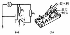 (1)电流-电压两用电表的电路如图(a)所示。已知图中S是双刀双掷电键,其外形见图(b),a、b、c、d、e、f为接线柱。双刀双掷电键的触刀掷向a、b时,e与a接通,f与b接通;掷向c、d时,e与c接通,f与d接通。灵敏电流计G的量程是0.001 A,内阻是100 Ω;电阻R1的阻值为9900 Ω,R2的阻值是1.01 Ω。那么:(1)触刀掷向a、b时,此两用表是 表;量程是 。(2)触刀掷向c、d时,此两用表是 表;量程是 。