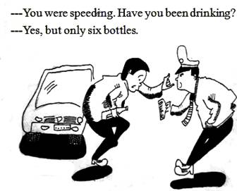 This is a picture which describes vividly a kind of common phenomenon among some drivers in our country. In the picture, a drunk driver is caught speeding. He has drunk so much that he can’t walk normally. How can he drive a car in such bad condition?
