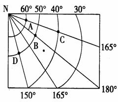 (1)A、B、C三点位于 半球(东、西),D点位于 半球(南、北)。(2)AC两点间的距离约为 千米。![]()