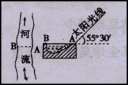 下图为某河流及其河床AB处的剖面示意图。某地理兴趣小组成员9月23日正午(地方时)在A处观测到的太阳高度角55°30′,且太阳光线与河岸接近垂直。据此回答12~13题。