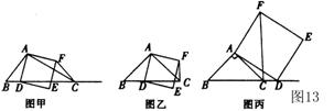 (1)如果AB=AC,∠BAC=90°,①当点D在线段BC上时(与点B不重合),如图乙,线段CF、BD之间的位置关系为 ,数量关系为 。