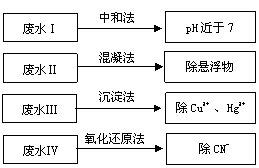 ④ 废水Ⅳ常用Cl2氧化CN-成CO2和N2,若参加反应的Cl2与CN-的物质的量之比为