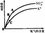 27.右图是胡萝卜在不同的含氧情况下从硝酸钾溶液中吸收K+ 和NO3- 的曲线。影响A、B两点和B、C两点吸收量不同的因素分别是