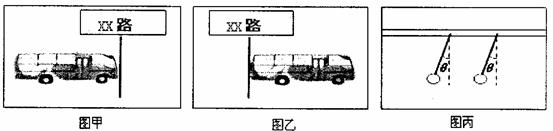 8.如图甲、乙所示,是一辆质量为6x103kg的公共汽车在t=0和t=3s末两个时刻的两张照片.当t=0时,汽车刚启动,在这段时间内汽车的运动可看成匀加速直线运动.图丙是车内拉手环所处位置的图片(悬绳质量忽略不计),θ=370,根据题中提供的信息,可以估算出的物理量是(取g=10m/s2)
