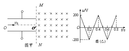 11.(15分)如图(甲)所示,两平行金属板间接有如图(乙)所示的随时间t变化的电压U,两板间电场可看作是均匀的,且两板外无电场,极板长L=0.2m,板间距离d=0.2m,在金属板右侧有一边界为MN的区域足够大的匀强磁场,MN与两板中线OO′垂直,磁感应强度B=5×10-3T,方向垂直纸面向里。现有带正电的粒子流沿两板中线OO′连续射入电场中,已知每个粒子的速度v0=105m/s,比荷q/m=108C/kg,重力忽略不计,在每个粒子通过电场区域的极短时间内,电场可视作是恒定不变的。