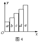 在“利用打点计时器测定匀加速直线运动加速度”的实验中,打点计时器接在50Hz的低压交变电源上。某同学在打出的纸带上每5点取一个计数点,共取了A、B、C、D、E、F六个计数点(每相邻两个计数点间的四个计时点未画出)。从每一个计数点处将纸带剪开分成五段(分别为a、b、c、d、e段),将这五段纸带由短到长紧靠但不重叠地粘在xoy坐标系中,如图4所示,由此可以得到一条表示v-t关系的图线,从而求出加速度的大小。