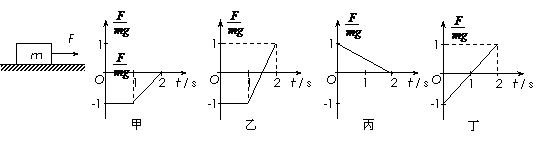 如图所示,在光滑水平面上有一质量为m的物体,它受到水平向右的力F的作用。力F分别按图甲、乙、丙、丁所示的四种方式随时间t变化(图中纵坐标是F与mg的比值,力沿水平向右为正)。已知物体在t = 0时速度为零,若用v1、v2、v3、v4分别表示上述四种受力情况下物体在2 s末的速率,则这四个速率中最大的是