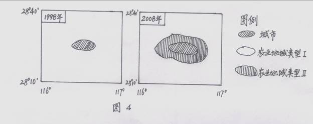 图4表示我国某地城市及周围地区农业地域类型变化示意图,读图回答9-11题。