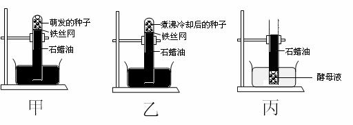 (16分)为探究种子萌发和酵母菌的呼吸方式及呼吸产物,有三组同学分别设计了下列实验。将等量萌发的种子和酵母菌培养液(5%葡萄糖溶液+10克酵母干粉,搅拌而成)分别放入甲、乙、丙三试管中,如下图所示(石蜡油短期内不影响生物生长)。三试管中均无空气存在,请据图回答: