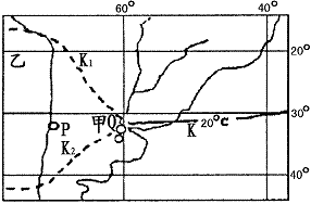①K1表示20℃等温线西半段,受地形和寒流的影响 ②K2表示20℃等温线西半段,受地形和寒流的影响 ③若乙海域水温比正常年份偏高,则附近渔场减产