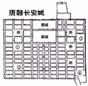 右图为《唐朝长安城示意图》,图中有四个标注:①市