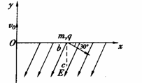例6、如图所示,一质量为m,带电荷量为+q的粒子以速度v0从O点沿y轴正方向射入磁感应强度为B的圆形匀强磁场区域,磁场方向垂直纸面向外,粒子飞出磁场区域后,从点b处穿过x轴,速度方向与x轴正方向的夹角为30°,同时进入场强为E、方向沿x轴负方向成60°角斜向下的匀强电场中,通过了b点正下方的c点,如图所示。粒子的重力不计,试求:
