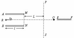 如图所示,两平行金属板A、B长l=8cm,两板间距离d=8cm,A板比B板电势高300V,即UAB=300V。一带正电的粒子电量q=10-10C,质量m=10-20kg,从R点沿电场中心线垂直电场线飞入电场,初速度v0=2×106m/s,粒子飞出平行板电场后经过界面MN、PS间的无电场区域后,进入固定在中心线上的O点的点电荷Q形成的电场区域(设界面PS右边点电荷的电场分布不受界面的影响)。已知两界面MN、PS相距为L=12cm,粒子穿过界面PS最后垂直打在放置于中心线上的荧光屏EF上。(静电力常数k=9×109N·m2/C2)