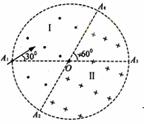 如图所示,在一个圆形区域内,两个方向相反且都垂直于纸面的匀强磁场分布在以直径A2A4为边界的两个半圆形区域Ⅰ、Ⅱ中,A2A4 与A1A3的夹角为60°。一质量为m,带电量为+q的粒子以某一速度从Ⅰ区的边缘点A1处沿与A1A3成30°角的方向射入磁场,随后该粒子以垂直于A2A4的方向经过圆心O进入Ⅱ区,最后再从A4处射出磁场。已知该粒子从射入到射出磁场所用的时间为t,求Ⅰ区和Ⅱ区中的磁感应强度的大小。(忽略粒子重力)。