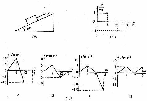17.图甲所示,在倾角为30°足够长的光滑斜面上,质量为m的物块受到平行于斜面的力F作用,其变化规律如图乙,纵坐标为F与mg的比值,规定力沿斜面向上为正方向,则丙中正确表达物块速度v随时间t变化规律的是(物块初速度为零,g取10m/s