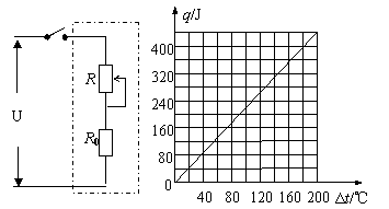 25.如图所示,是一种家用电熨斗的电路原理图(额定电压为220V),虚线框内为加热电路.R0是定值电阻,R是可变电阻(调温开关).该电熨斗温度最低时的耗电功率为121W,温度最高时的耗电功率为484W.则R0的阻值为________Ω;假定电熨斗每秒钟散发的热量q跟电熨斗表面温度与环境温度的温差关系如右图所示,现在温度为20℃的房间使用该电熨斗来熨烫毛料西服,要求熨斗表面温度为220℃,且保持不变,问应将R的阻值调为________Ω。