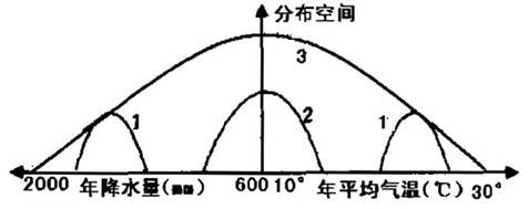 图1为水稻种植业、商品谷物农业和乳畜业的空间分布范围(曲线与横坐标围成的区域)与热量、水分条件的关系。完成3-5题。