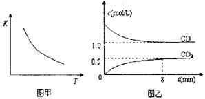 Fe(s)+CO2(g),已知该反应的平衡常数(K)的与温度(T)的关系如图甲,图乙是T1温度下该反应的c-t关系图像。则下列说法正确的是 ( )