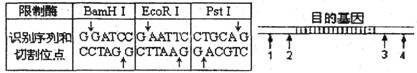 下表为几种限制酶识别的序列和切割的位点。如图已知某DNA在目的基因的两端1、2、3、4四处为酶切位点。现用BamH I和EcoR I两种酶同时切割该DNA片段,酶切后单个含目的基因的DNA片段自身不能连接成环状。据此判断下列各种酶切位点分别为: