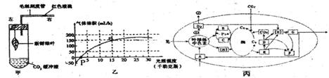 28.(16分)利用甲图实验装置测得某阴生植物叶片在不同光照强度下气体体积变化曲线如乙图,丙图示发生在该叶片中某叶肉细胞的代谢过程。