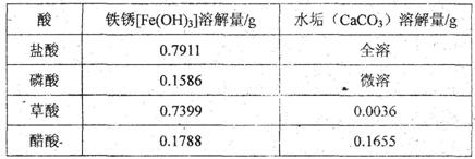 (4)下表为物质的量浓度相同的几种酸对铁锈及锅炉水垢的溶解性的比较: