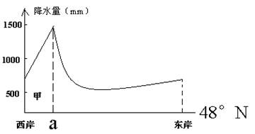 下图为某大陆北纬48°沿线地区的年降水量变化示意图,据此回答1-2题
