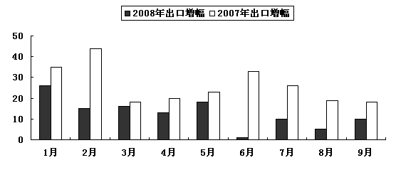 40、材料1:2008年、2007年广东省1-9月份出口增幅变化统计