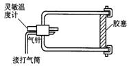 4. 如图所示,厚壁容器一端通过胶塞插进一支灵敏温度计和一根气针;另一端有可移动的胶塞(用卡子卡住),用打气筒慢慢向容器内打气,增大容器内的压强.当容器内压强增到一定程度时,打开卡子,在气体把胶塞推出的过程中 ( )