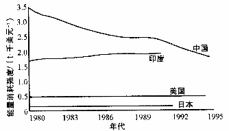 ①发展中国家的能耗强度都在逐年下降 ②1980年至1995年中国的能耗强度约下降了50% ③若按目前的趋势发展,2000年中国能耗强度将达到美国的水平 ④按目前的趋势发展,2000年中国能耗强度仍比美国的水平高 ![]()
