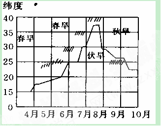 下图是副热带高压活动与我国夏季东部雨带关系示意图,折线表示副热带高压脊所在的位置,阴影部分表示雨带的大致位置。完成10-11题。![]()