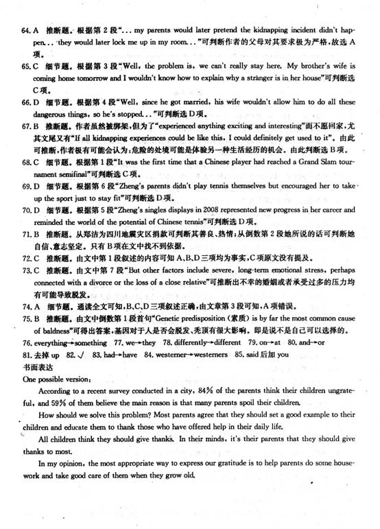 最近某市就“家长和孩子对感恩的理解”这一话题进行了一项调查。请根据下表所提供的信息写一篇英语短文,并简要发表你的观点。